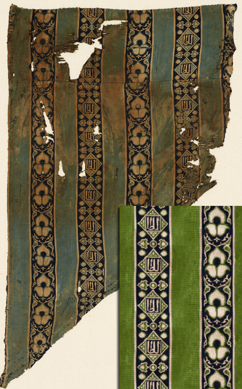Mamluk textile 15th Century with restored piece inset. Repeats seamlessly.
