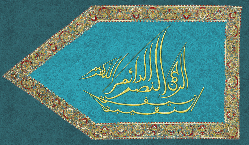 A banner made upon request from an extant rug and caligraphy with embroidery texture added digitally.