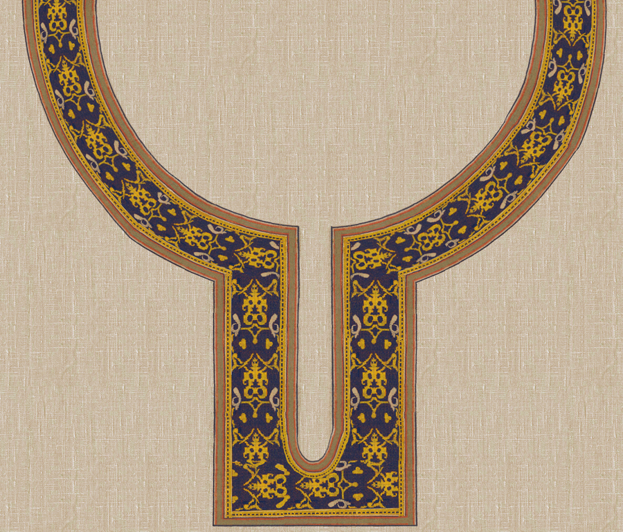 This fragment was taken from a extant sleeve. I created trim and a keyhole neckline from it.